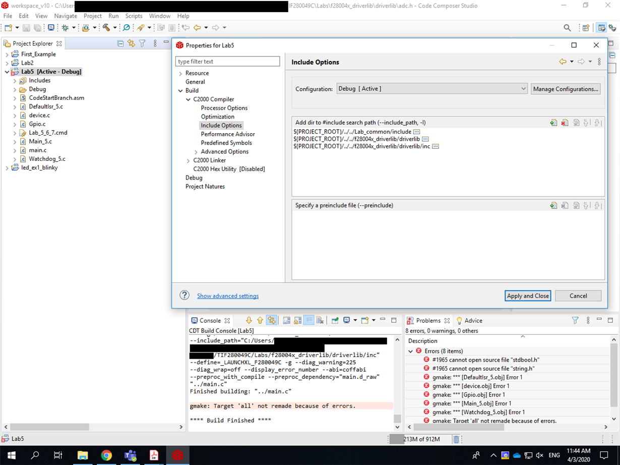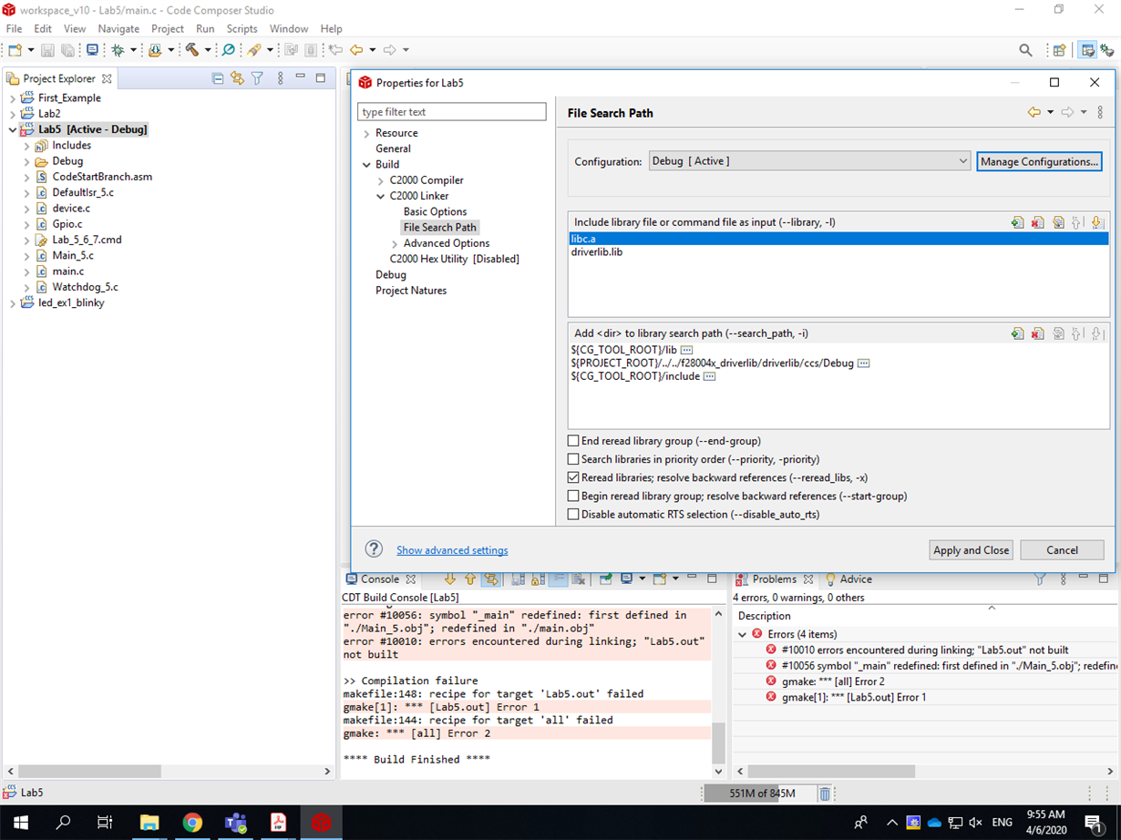 Description Resource Path Location Type #10008-D cannot find file "driverlib.lib" Lab5 C/C++ Problem #10010 errors encountered during linking; "Lab5.out" not built Lab5 C/C++ Problem #10056 symbol "_main" redefined: first defined in "./Main_5.obj"; redefined in "./main.obj" Lab5 C/C++ Problem <a href="file:/C:/ti/ccs1000/ccs/tools/compiler/dmed/HTML/10234.html">#10234-D</a> unresolved symbols remain Lab5 C/C++ Problem gmake: *** [all] Error 2 Lab5 C/C++ Problem gmake[1]: *** [Lab5.out] Error 1 Lab5 C/C++ Problem unresolved symbol _Flash_initModule, first referenced in ./device.obj Lab5 C/C++ Problem unresolved symbol _GPIO_setDirectionMode, first referenced in ./Gpio.obj Lab5 C/C++ Problem unresolved symbol _GPIO_setPadConfig, first referenced in ./Gpio.obj Lab5 C/C++ Problem unresolved symbol _GPIO_setPinConfig, first referenced in ./Gpio.obj Lab5 C/C++ Problem unresolved symbol _GPIO_setQualificationMode, first referenced in ./Gpio.obj Lab5 C/C++ Problem unresolved symbol _Interrupt_initModule, first referenced in ./Main_5.obj Lab5 C/C++ Problem unresolved symbol _Interrupt_initVectorTable, first referenced in ./Main_5.obj Lab5 C/C++ Problem unresolved symbol _SysCtl_setClock, first referenced in ./device.obj Lab5 C/C++ Problem