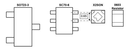 図2:『SOT23-3』、『SC70-6』、『X2SON』パッケージのピン・ピッチとの比較と0603抵抗器
