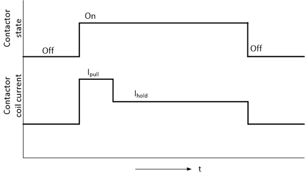 図2に、低電圧コイル内の電流のプロファイルを示します。この電流プロファイルは、「プルイン・アンド・ホールド」プロファイルと呼ばれます。コンタクタが最初にオンに切り替わったとき、コイル内の初期電流は大きな値です。これがプルイン電流であり、図2のipullで示されています。プルイン電流に続き、コンタクタがオンになっている残りの時間は、図2のiholdで示される一定のホールド電流が流れます。プルイン電流によって接点の接続を確実に行い、ホールド電流によって接点をそのままの状態に維持します。