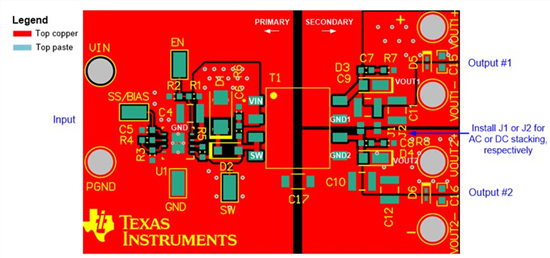 図4は、図1と同様のスタック出力のプリント基板(PCB)レイアウトです。この設計では、高電流能力のフライバック・コンバータ『LM25184』と13mm×11mmのトランスを使用しています。ジャンパのオプションで、出力をDCもしくはACのスタック、またはガルバニック分離された独立した出力として設定します。