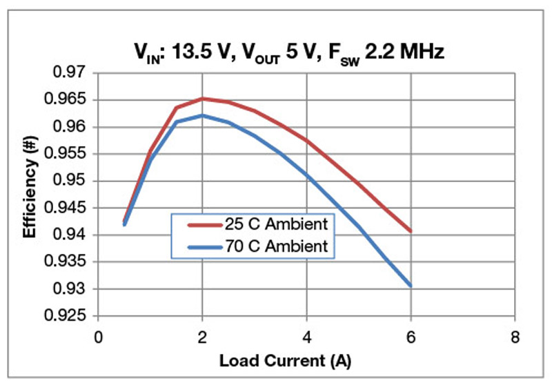熱は、あらゆる高性能コンピューティング・アプリケーションで大きな問題の1つとなります。電力管理ソリューションがシステムの熱動作範囲を劣化させることはできません。図2に、『LM61460』の標準効率曲線を示します。全負荷で93%を超えるピーク効率により、DC/DCコンバータからの発熱が劇的に低下します。