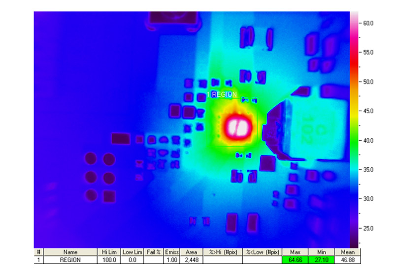 図3は、全負荷条件で動作中の『LM61460』のサーマル・イメージを示しています。PCBと周囲間の熱係数の測定値は19.7˚C/Wで、DC/DCソリューションによるPCBの温度上昇が低くなっています。高い変換効率により、対流による熱が最小限に抑えられます。