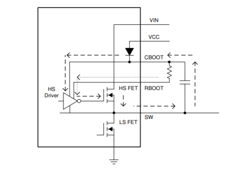 『LM61460』は、設計エンジニアがスイッチ・ノードのスルー・レートを制御できるようにすることで、コンパクトなシステムに混乱を引き起こす放射および伝導ノイズを最小限に抑えるのに役立ちます。スルー・レート制御によってスイッチング波形の高調波成分が減少し、存在する高調波のエネルギーが低下します。図4に、RBOOTを使用してドライブ強度を制御するスルー・レート制御機能を示します。