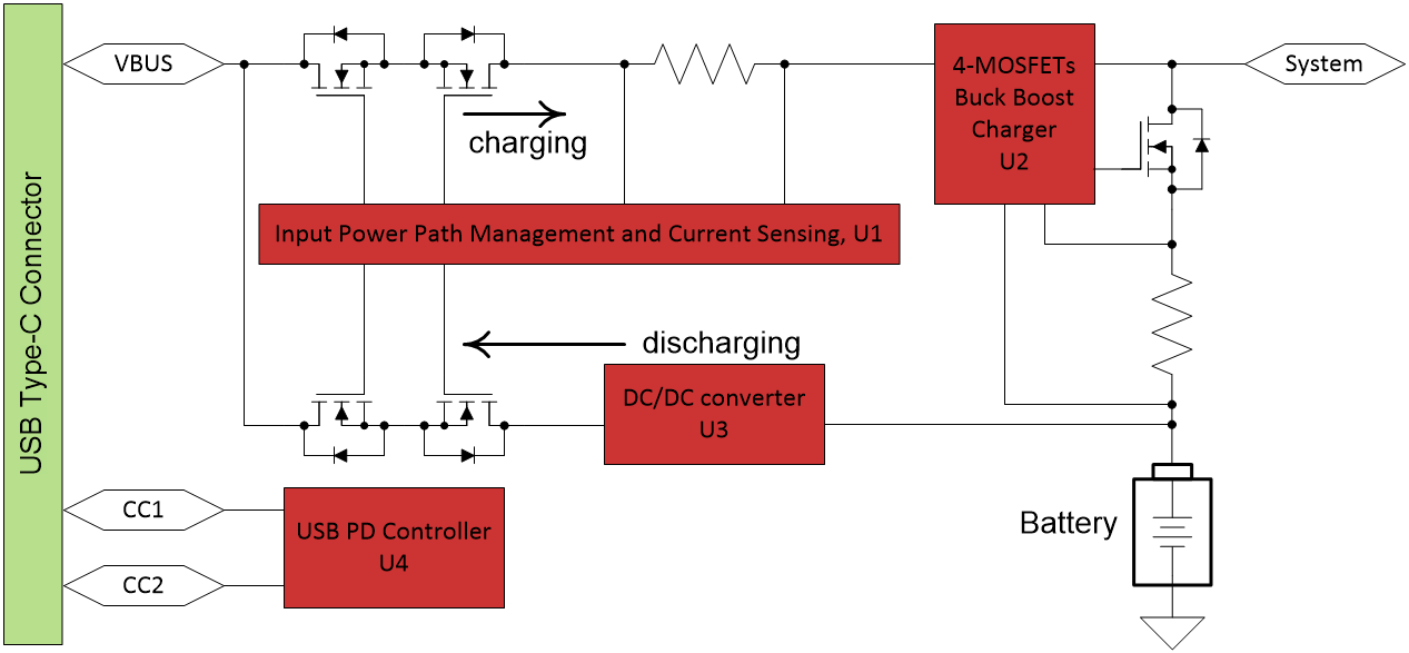 USB Type-Cが幅広く普及することによる重要なメリットの1つは、ユニバーサル・アダプタの実現と、それに伴う電気電子機器廃棄物の削減への現実的な道筋ができることです。USB Type-Cのコネクタは統一されていますが、従来の5V USBアダプタや5V~20Vの電圧供給能力があるUSB PDアダプタといったように、電力定格と電圧にはまだばらつきがあります。それに加えて、内蔵されるバッテリ・セルの数も携帯機器ごとに異なります。このように入力電圧とバッテリ電圧にばらつきがあることから、バッテリ・チャージャ集積回路(IC)には昇降圧トポロジが必要になります。電力密度の高い昇降圧チャージャには、一般的な充電機能ブロックを統合するだけでなく、システム設計の効率化、BOMコストの削減、ソリューション全体のサイズ縮小のために、USB PD充電システムの負荷スイッチやDC/DCコンバータといった部品も統合しなければなりません。図1は、USB PD充電ソリューションのシステム・ブロック図です。