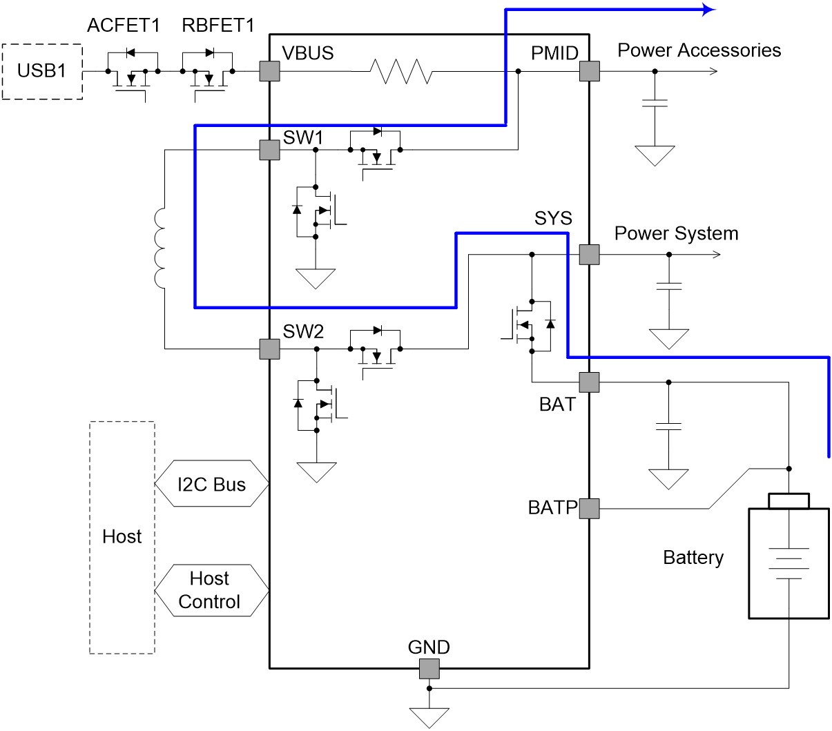 USB Type-CポートのFRSをサポートするために、この統合型昇降圧チャージャには新型のバックアップ・モードが取り入れられています。ここで言うバックアップ・モードとは、バス電圧が暴走することなく、順方向充電モードから逆方向OTGモードへと昇降圧チャージャを超高速に切り替えることを指します。図3のアプリケーション回路図を見ると、USBポートに接続したアダプタは、システムに電力を供給し、昇降圧電源段を通してバッテリを充電します。それと同時に、チャージャのPMID出力を通ってアクセサリ類にもアダプタから給電される場合があります。アダプタが取り外されても、バッテリの内部のFETが引き続きシステムに電力供給することができます。ただし、PMIDのアクセサリ類への給電はなくなるかもしれません。