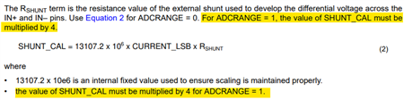 Hi, I have issue reading current back from INA229 EVM. I am using it in ADC range =1 mode and calculating current shunt based on the following equation: SHUNT_CAL = 13107.2 x 10^6 x CURRENT_LSB x RSHUNT. But the current measurement is 4 times more than the actual value. Is the internal fixed value on the equation (13107.2 x 10^6 ) only for ADC range=0 or for both ranges? There is no information about this on the datasheet.