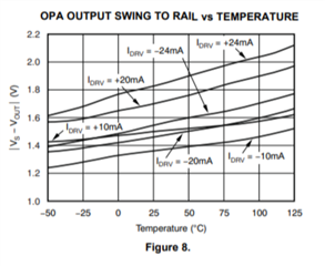 Figure 8 shows a typical output swing of |Vs - VOUT| = ~1.5V from the rail at 25C, and typical output swing |Vs - VOUT| = 1.57V at ~85C and |Vs - VOUT| = ~1.42V at -40C with +10mA load.