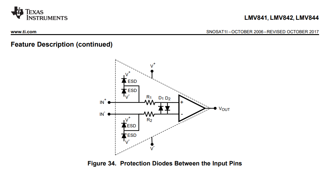 All diodes shown in Fig 34 are input protection diodes: D1 and D2 for overvoltage protection while remaining four are ESD protection (see label).