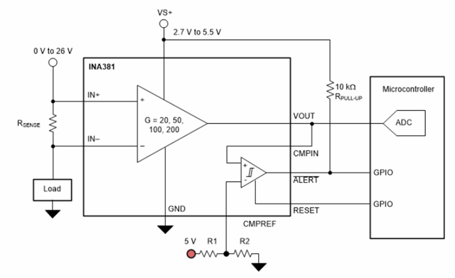 I have seen that the comparator inside INA381 is connted to the VOUT, which is output from the fist-stage amplifier.