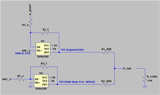 DAC_2 is then stepped from 0 up to a small voltage which after the inverting amplifier puts U2:OUT from 0 to -0.683mV. These two voltages then are summed together through the current flowing through the large R_ADD resistors when a small load is attached to V_OUT. When no load is attached they create a voltage divider network with <10nA of current flowing between the two amps.