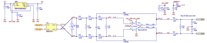 I'm using this fully differential amplifier circuit to measurement a small current (100uA - 3.6mA, 50Hz):