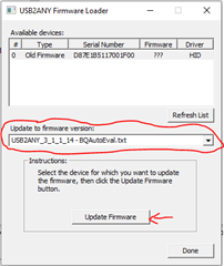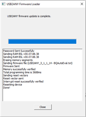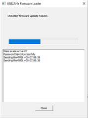 I recently purchased a USB2ANY to interface with the GUI of an Eval Board. Upon opening the GUI, the GUI prompts me to update the version of USB2ANY to 3.1.1.14. However, when trying to update the version it fails. I have performed all steps in this guide BQ79616-Q1 and BQ75614-Q1 Graphical User Interface (GUI) User's Guide (ti.com) page 3-4 including the download of the SDK and putting the file in the same folder. The SDK I have downloaded is from the TI USB2ANY webpage and shows to be API v2.8.2.0. I have also correctly pressed the BSL button and performed the subsequent steps. I have basically performed all steps in the guide perfectly. I have also shared some photographs so that it is easier for TI to evaluate the issue. I also noticed that using the SDK the firmware correctly gets updated to v2.8.2.0.