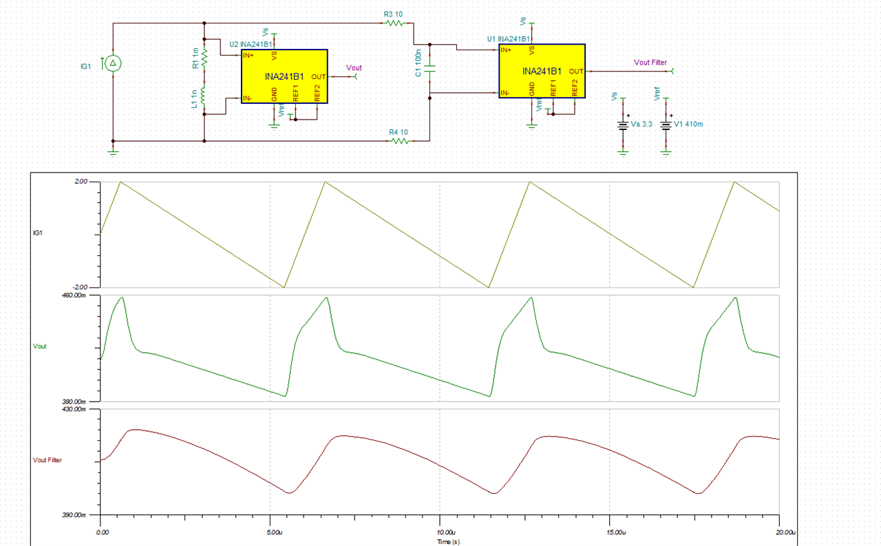 My customer is using INA241B for solar inverter high-side current sensing. But in test waveforms, INA241 output can follow actual current change at the beginning of cycle begin, but can't follow afterwards and turn down.