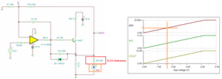 But when the board in house, we test the actual circuit, when the load is 979omh, the circuit can’t work well, the test data as below, we can see the error rate of the output voltages will be bigger when the input voltage to be smaller . And the Vbe, V+, V- listed as below. It seems like the positive and negative voltages of the operational amplifier are not equal, and the virtual break cannot be established when the circuit can’t work well. What causes the V+ to be not equal to V- of the TLV9304? Is it due to insufficient driving capability of the operational amplifier?