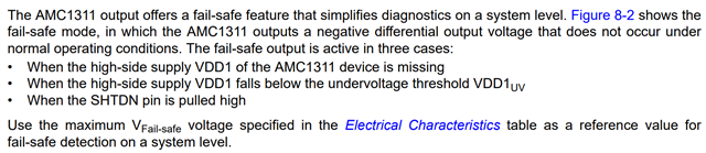 we are using a AMC1311B. What happens with the output voltages (OUTP and OUTN) when the input side of the AMC1311B is without power (VDD1 zero)?