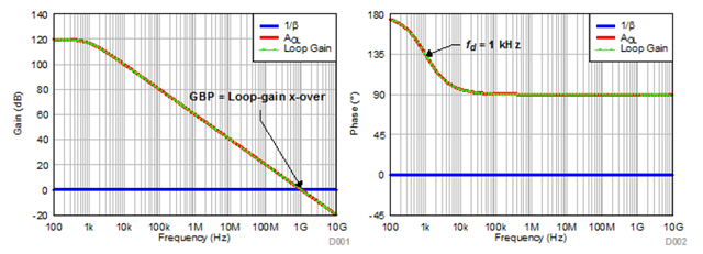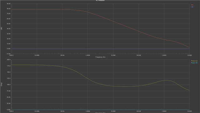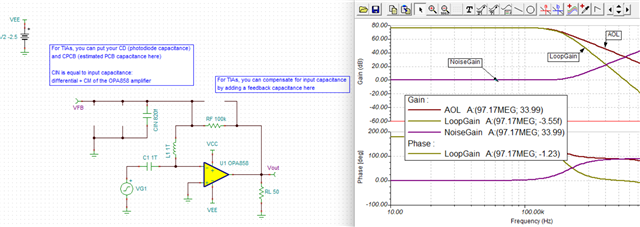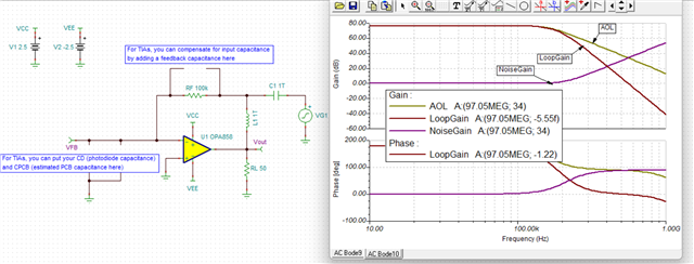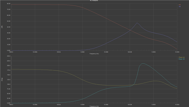 I´m trying to replicate the simulations idea of the document "What You Need to Know about Transimpedance Amplifiers – Part 1" at page 2 for determining the magnitude and phase of loop gain, AOL and 1/β. I was expecting a curve like this one stated iin the document