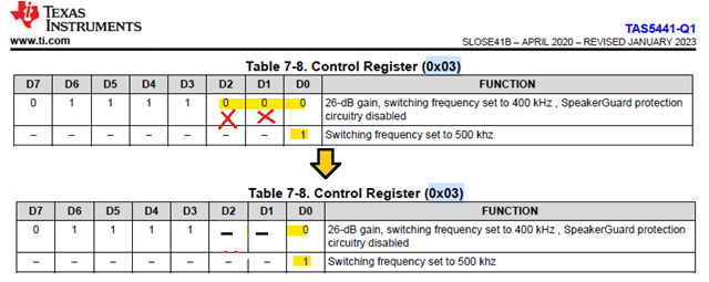 First row of Table 7-4 shows Data bits [D2 D1 D0] = [0 0 0] to set the Switching Frequency to 400kHz whereas on second row, when D0 = "1" , the Switching Frequency is set to 500kHz.