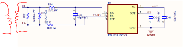 I am using INA199A1 to sense current from current transformer. I am attaching the schematic snapshot. I am getting non-linear output . Please suggest what am I doing wrong.