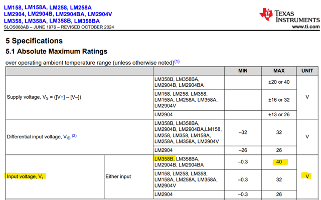 Please let me confirm if there is the ESD protection diode between input and V+. From the LM358B datasheet, Absolute maximum ratings, I do not understand that.