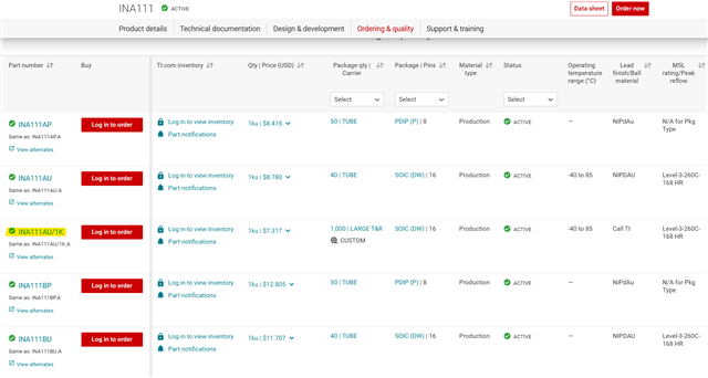 But we couldn't order this because system says this device, INA111AU/1KE4 is not OK to order.