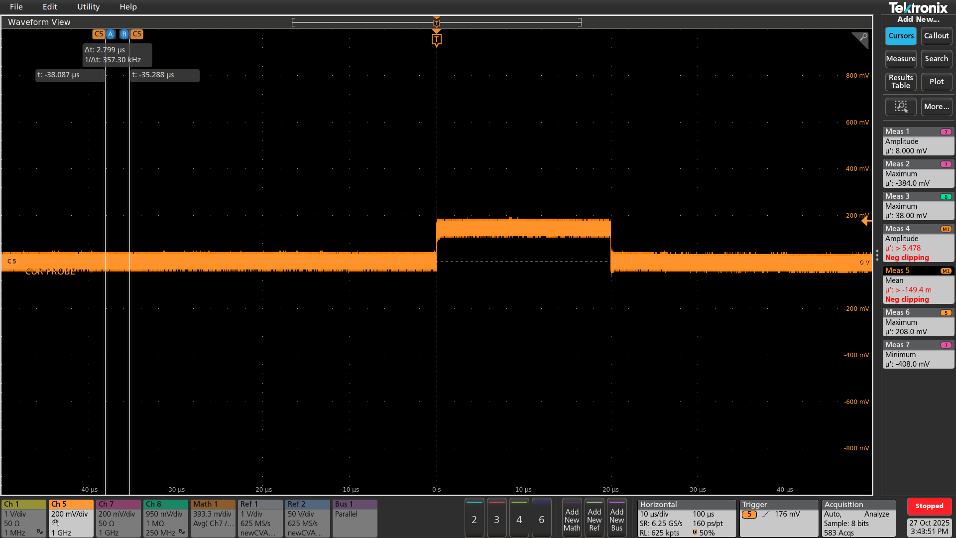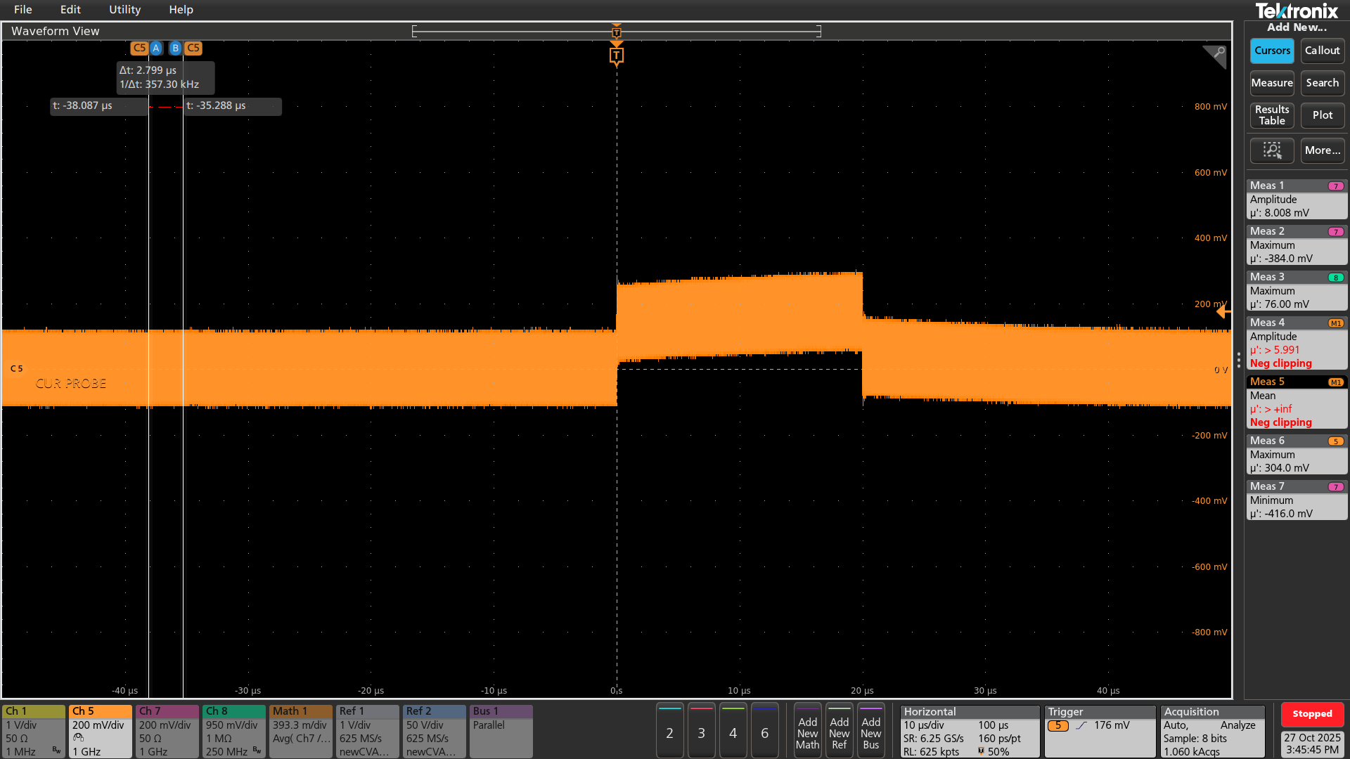 When the board is not connected to the function generator (open input), it exhibits noise levels of approximately +/- 1.5 to 2V. Shorting both inputs together does not seem to have any effect. When the board is connected to the function generator, oscillations occur when the orientation of the cables is changed. We have replaced several cables, but this has not resolved the issue.