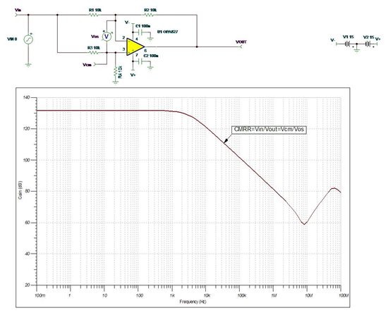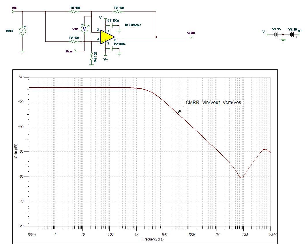For ac CMRR graph (using a difference amplifier configuration as shown above), CMRR=Vcm/Vos=Vin/Vout BUT for dc CMRR=(delta_Vcm)/(delta_Vos).