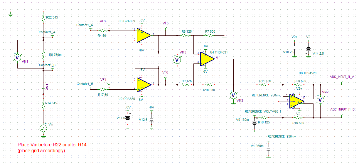 I am using two opamps (buffers) to measure the voltage over the resistor. These voltages are fed into the THS4631 (difference amplifier) and the output is fed into a fully differential opamp.