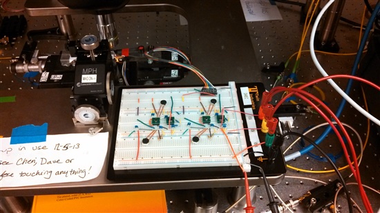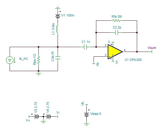 Hi all. I have an application where I have two pairs of detectors from a photonic chip. The goal is to run each detector pair through an OPA2380 and use the outputs as the inputs of the INA157. So my breadboard consists of two OPA2380s and two INA157s, one for each pair of detectors. A picture is attached. Unfortunately we have a relatively large DC component and a small AC component, so increasing the transimpedance gain to amplify the AC will only saturate the OPA2380. Ideally I would like to AC couple to the TIA, but I know that has some issues, given that the capacitor can cause the photodiodes to move into forward bias. Would it be possible to place a capacitor in series with the OPA2380 and an inductor in parallel to provide a DC path without effecting the bias point? The frequency of operation is relatively low, between 100kHz and 750kHz.