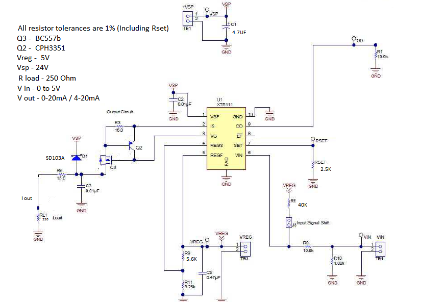 I would like to use XTR111 to obtain 0 to 20mA/4 to 20mA current output for 0 to 5V input. Attached herewith is the schematic along with PMOS (CPH3351) and BJT(BC557b) datasheets for reference.