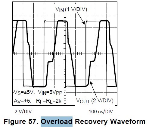 So, you can see the overload recovery waveform in the LMH6642, copied below, as being representative of the behavior of the LMH6639 as well.