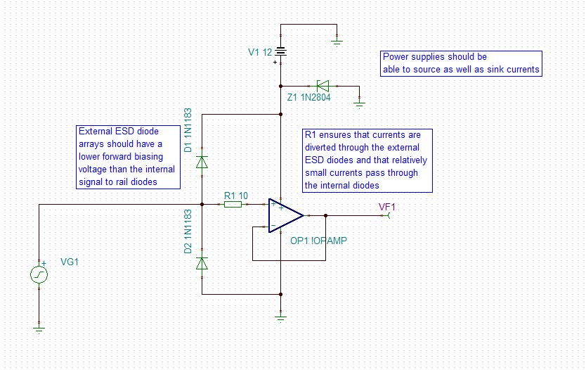 The absolute maximum ratings of OPA2234 state an input voltage of (V+)+0.7V. Because of the voltage I assume that the input is internally protected by a diode.