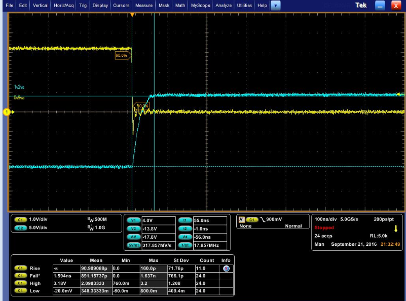For normal device,the high level of output is about 4v to 4.5V,and the voltage will not change when the output current is about 30mA(Yellow is input,blue is output)