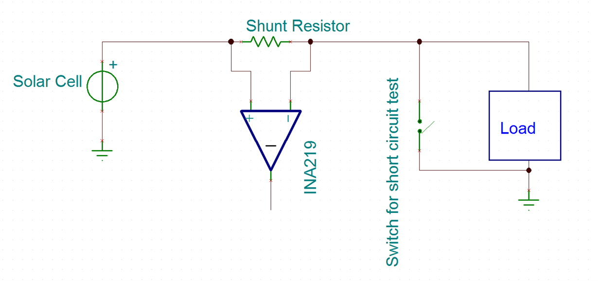 I recently acquired some small solar cells which I'm trying to characterize. They're rated for 6V at 100mA. While I can measure their open-circuit voltage easily, I also need to determine their short-circuit current values. In my opinion, this would involve connecting the solar cell + terminal to the Vin+ terminal of the INA219, and then connecting the Vin- terminal and solar cell - terminal to ground, essentially providing a "short-circuit" of sorts. However, there is a warning in the datasheet stating that situations resulting in large voltages being dropped across the shunt resistor (I'm using a 0.1 ohm shunt) should be avoided. Can anyone please tell me how to go about measuring this short-circuit current with the INA219, or if this is even possible with it?