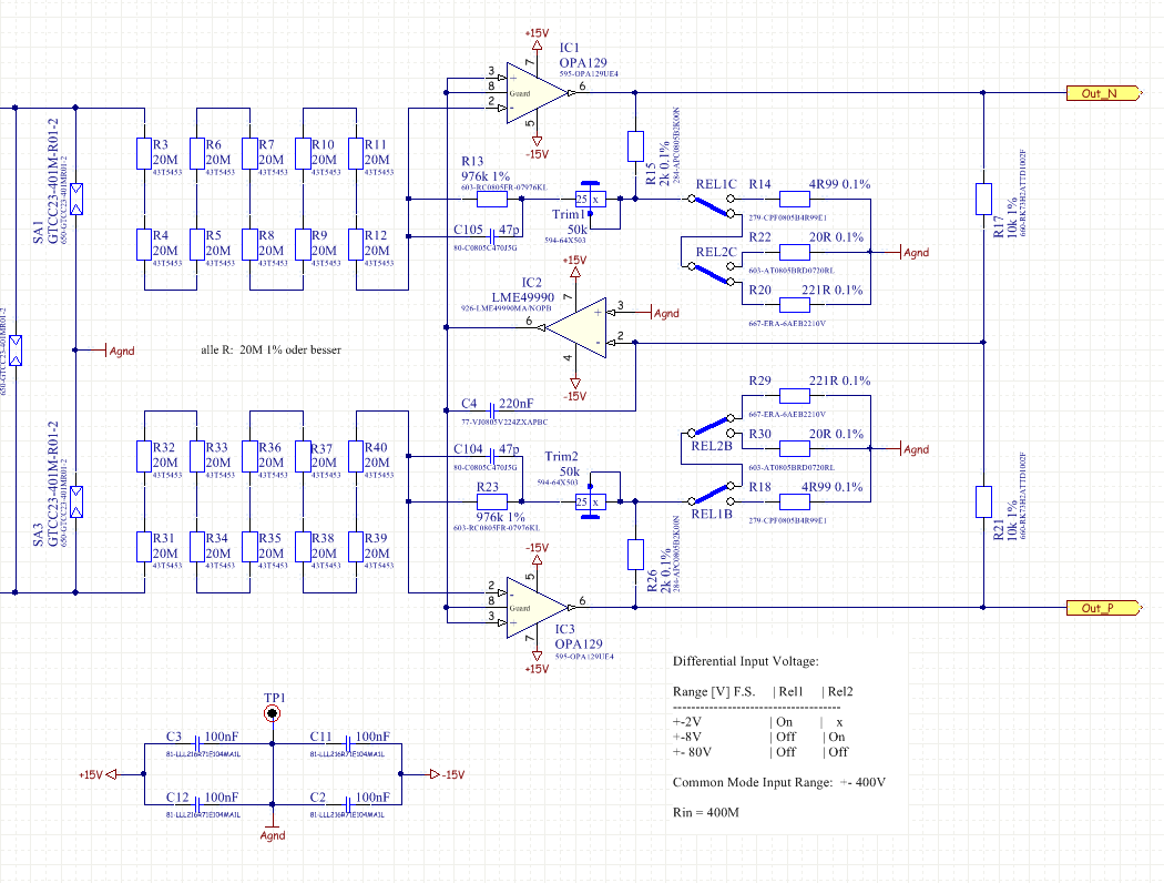 I need an amplifier, differential in, differential out, three ranges 80V, 8V and 2V, common mode range of +-400V, 400M Input Impedanz. I found an solution, but the Offset is very high expecially in the 2V range. How can I fix that?
