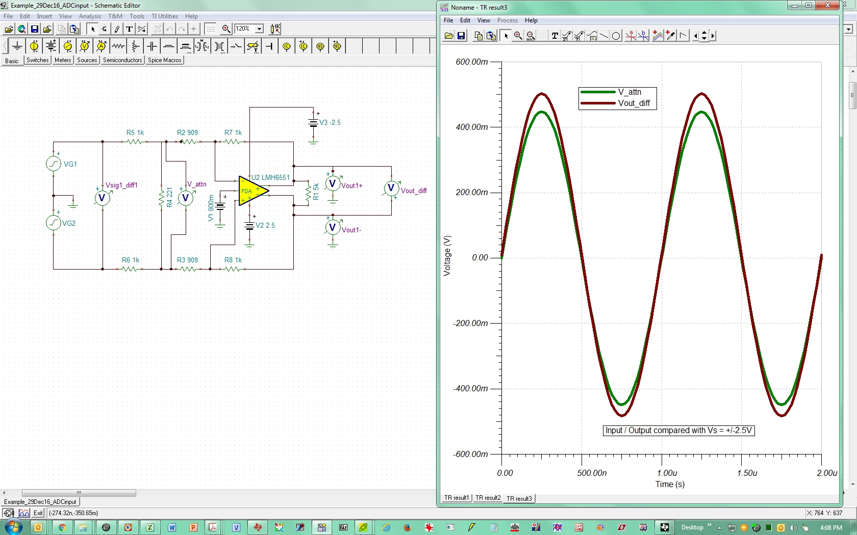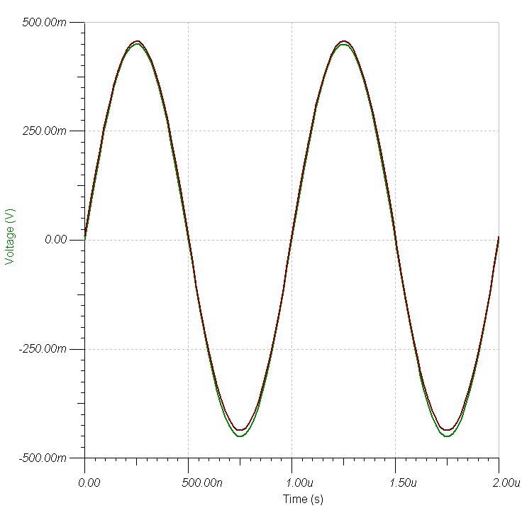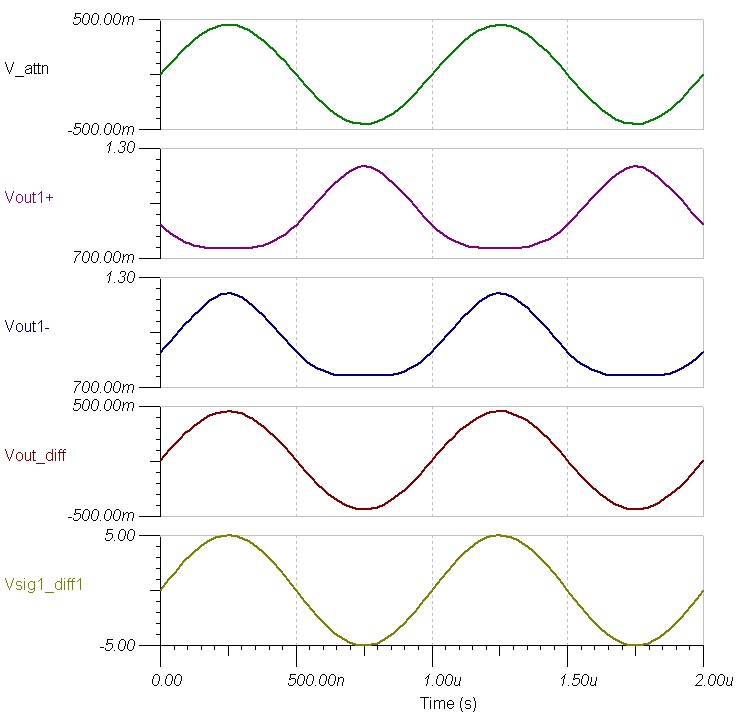 3) Vout_diff voltmeter is inverted in-order to see if the input and output waveforms are similar. It can be seen that there is a small dc-offset introduced in the output.