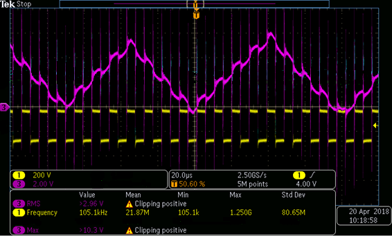 The ISO124 output is shown in the next oscilloscope capture in magenta with 700V constant DC input when the converter is switching around of 100-120 kHz.