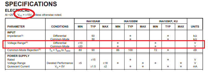 I am using the INA105 in a difference amp configuration to receive a signal output which can go up to +10.5V. When the input signal rises above +9V the output of the INA105 will follow the input signal to almost 10V and then clips to around 8V. I am using +/- 12V supplies for the INA105. I increased the +12V supply to +13.1V and it appears to work better. I have another device on the board that prevents me to go beyond 13.2V on the positive power supply rail.