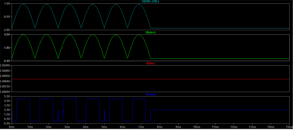 I have set the Ref as 2.5V to inverting pin and given sign wave of Amplitude 4V and Freq 400Hz to non inverting pin. I am seeing a glitch in the output waveform. Can you help me to sore this Issue.