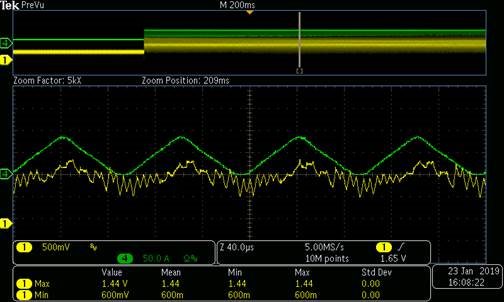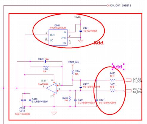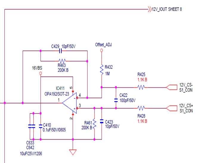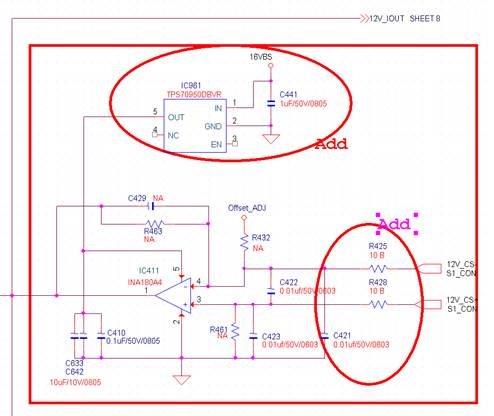 The test result is below: CH4: Output current(3A-111A); CH1: INA180A4 output C422 = 100Pf, C423 = C421 = 1000pf