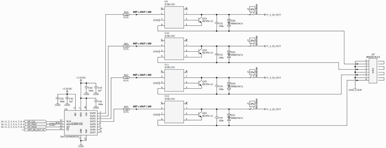 V_4_20_OUT is an external loop voltage referenced to GND_LOOP (not referenced to GND). When only one of the four jumpers is set everything works fine. But as soon as I set a second jumper I measure a currentflow in the first loop of up to 30mA (depending which jumper is set). And on the pin 2 of the XTR115 I measure -0.5V (output of the DAC is 0V). I do not see what the problem is and where/why the wrong current is flowing.