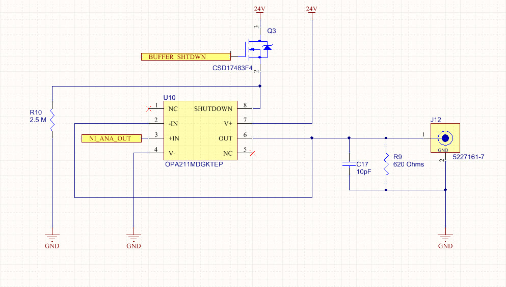 I am trying to get the OPA211MDGKTEP amp to work as a unity gain buffer with the Shutdown signal as an enable. The application is pretty simple, I run my signal (1kHz 1Vpp 1.5V offset sine wave) into the + of the op amp with the output tied to the - and a R load and C load of 620 Ohms and 10 pF, respectively. The rails are tied to 24V and 0V. The shutdown Pin was attached to a pulldown resistor and the source of a transistor but that transistor proved to not be biased properly so it was taken off entirely.