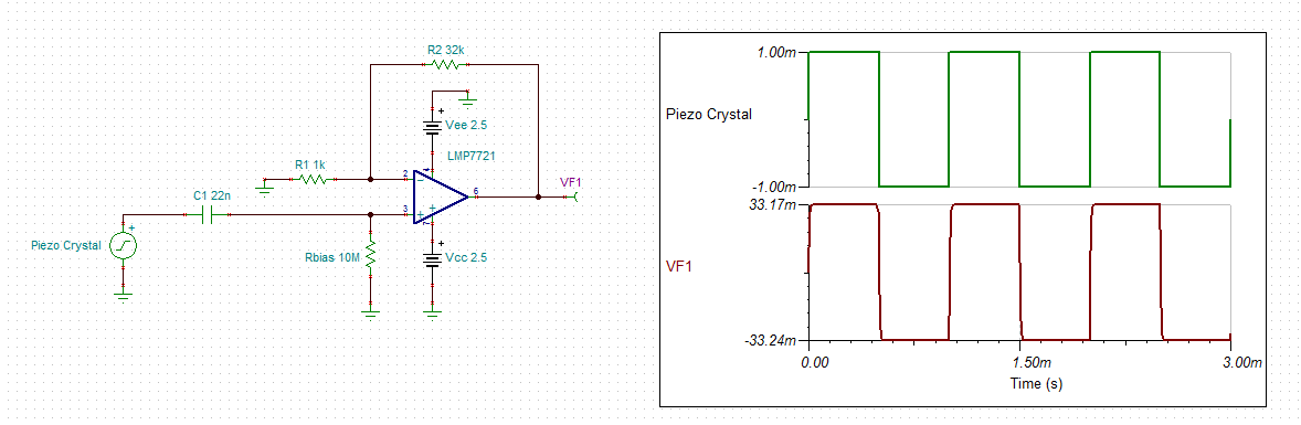 The LMP7721 eval kit is set to a gain of 33, V+ is 2.5V and V- is -2.5V. Vref is ground. Non-inverting default mode. When a 1mV square signal is connected from a signal generator, I get the required output gain. But when I connect a Piezo crystal the Output is railed to +2.5V. Only when I excite the crystal which should produce a good enough signal, I see some small negative bumps in the oscilloscope. Please let me know what changes are required to get the amplifier working for a Piezo crystal.