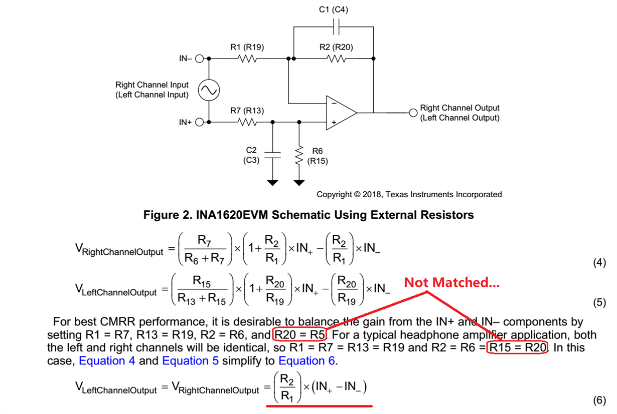 But using Equation (6) ,VRightChannelOutput = (R2/R1) * IN+ =2 * IN+