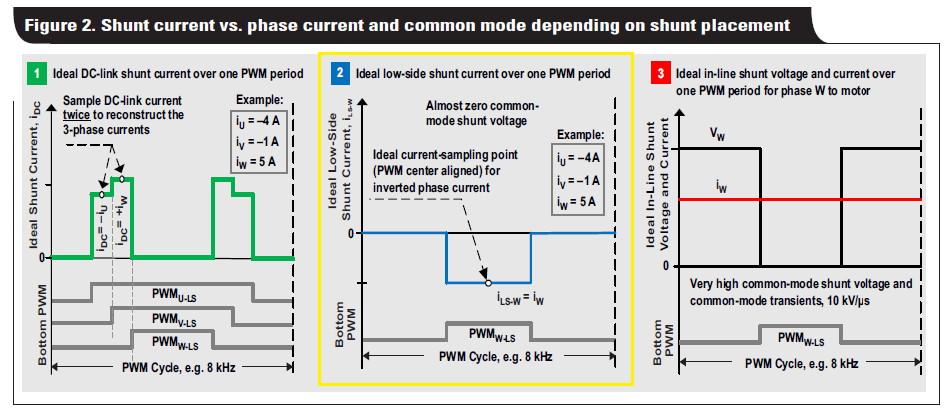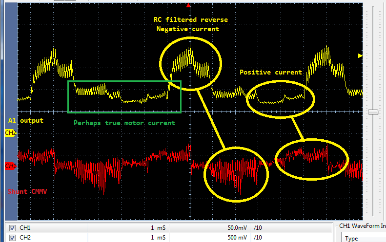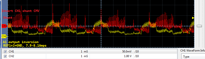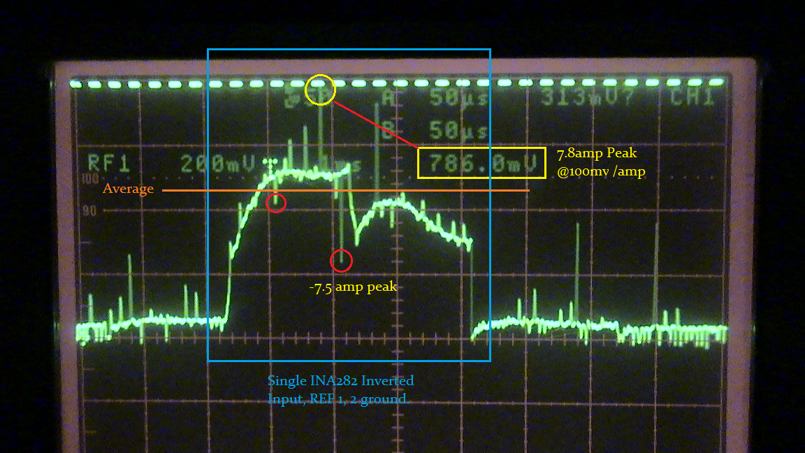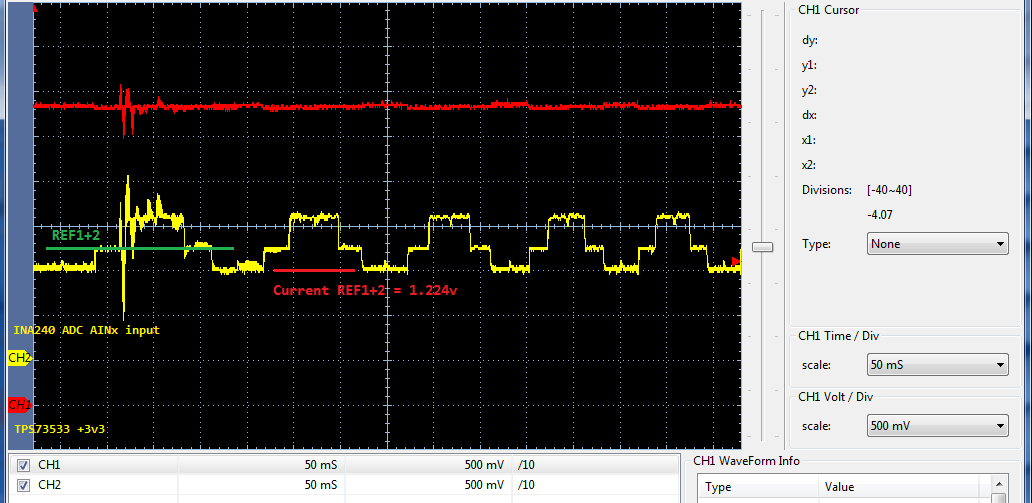 When 240 REF1/2 are wired +1.225v that seemed to occurre and I was challenged in this forum it was impossible. The bad part was the 240 output raised shunt inversion above REF1/2 +1.225v threshold. A scope capture seemed to indicate the shunt signal on 240 output was indeed inverted and became obvious via added 22nF decouple filter cap into ADC. Can TI confirm Fig2-2 is accurate low side shunt signal is inverted, when +IN non-inverting input faces B+ on low side monitor? It seems when REF1/2 wired to GND the 240 output inversion is seemingly not occurring as bad. Yet it seems the +IN should be measuring forward current into ground and instead is measuring inverter reverse current, e.g. Fig2-2 example above (>0v) ground. Shunt inversion seems to explain why scope tends to capture PWM transients outside 240 sample point. Oddly the sample point (Fig.2-2) is occurring >400us after the timed event and should be occurring no later than 9.6us @0.5% of final value.