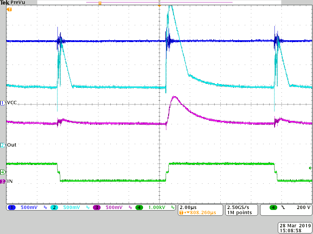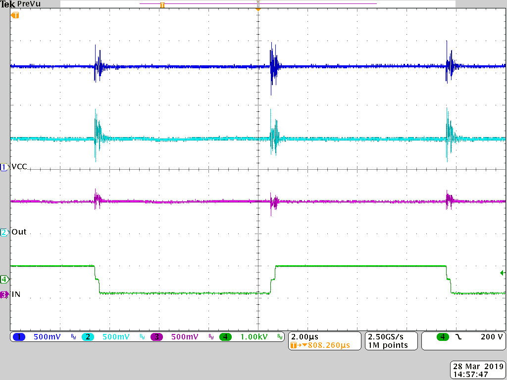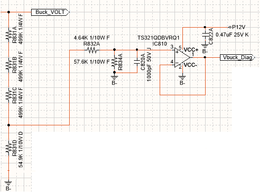 My customer is using TS321-Q1 in buffer circuit for DC input voltage sensing. However, during every switching rising and falling edge of main DC/DC converter, TS321 output will have glitch and overshoot. Please see waveform and schematic below: