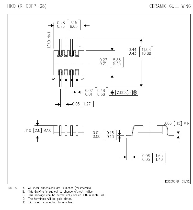 I'm planning on using a OPA211-HT op amp, the only high temp packages available are ceramic dual flatpack (HKJ) and the ceramic gull wing (HKQ). The HKJ needs lead forming which i don't want to do, so that leaves the HKQ gull wing.