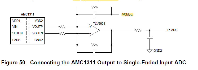 But then, the converted output signal (output signal of TLV6001) must be shifted to the common mode voltage of ADC, again to allow signals of both polarities. That's why the terminal labeled with "VCMADC" isn't connected to signal ground as it is usually done with a differential amplifier but to the common mode voltage of ADC (VCMADC).