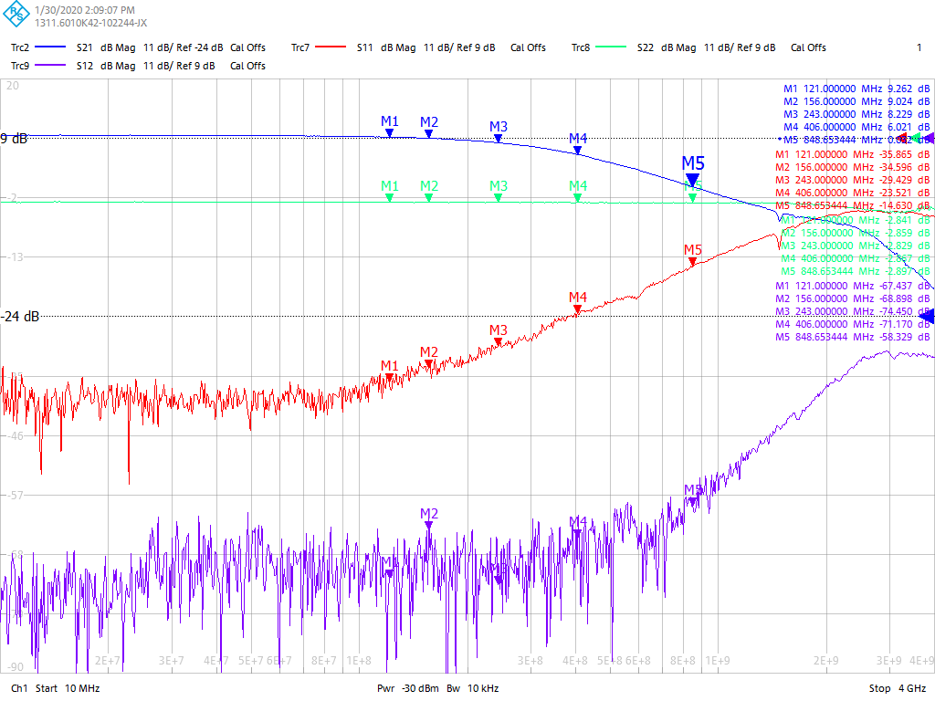 - To detail the test setup, we are using a Rhode & Schwarz ZNB 8 Vector Network Analyser, calibrated to TOSM with an SMA 50ohm calibration kit, sweeping from 10MHz to 4GHz, and measuring standard S-Parameters.