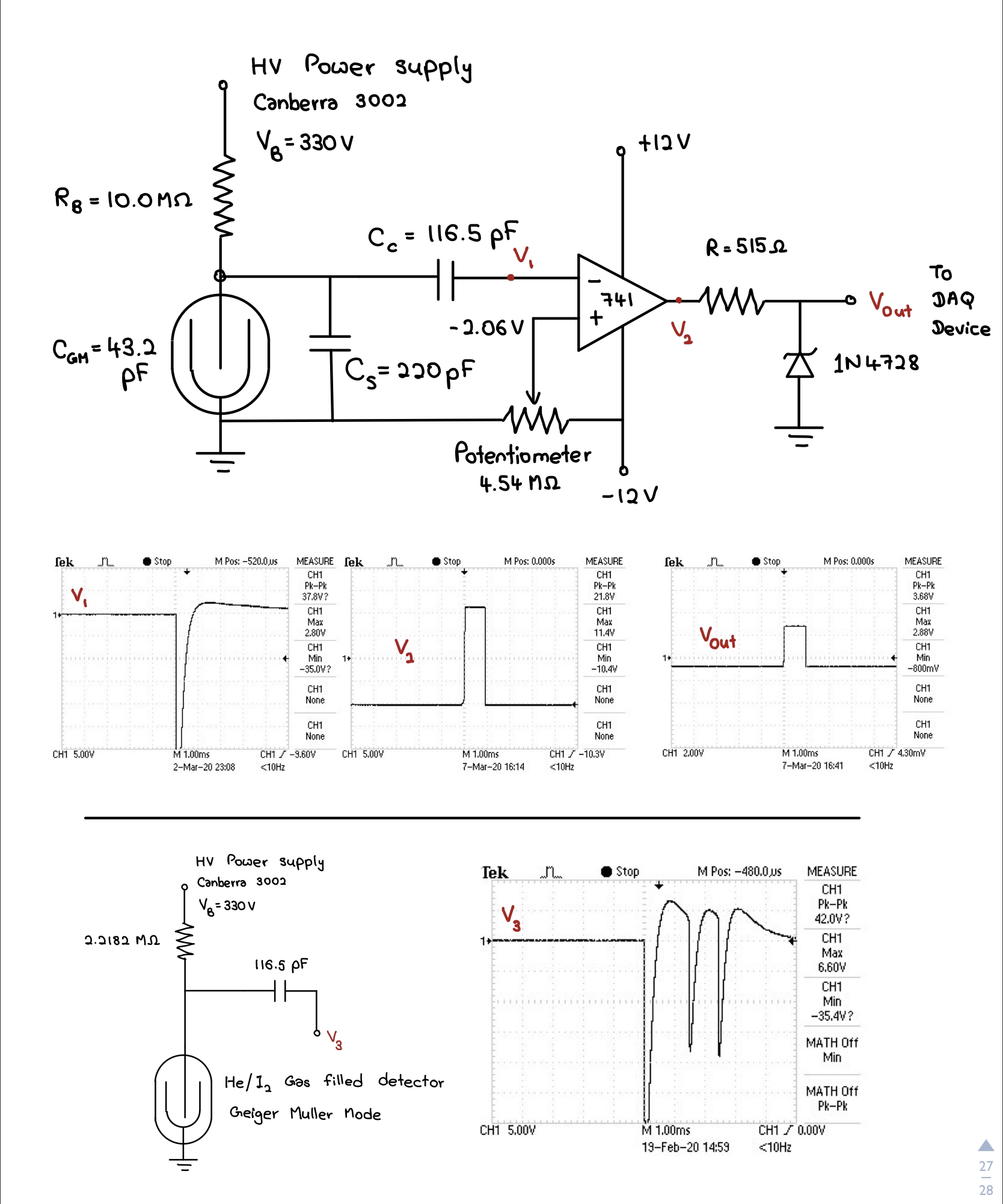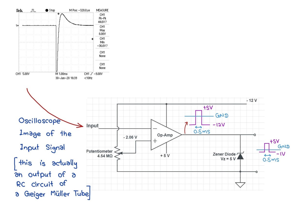 Hi! I am currently working on designing a Compactor Circuit for a pulse signal from GM Tube as shown in Oscilloscope! It would be grateful, if you could help me to figure out the best Part number for the Op-Amp IC and the Zener Diode for the circuit below. The specialties I am looking from the Op-Amp IC is it can detect 500 microseconds pulses and getting a TTL pulse for the computer with ultra low noise (Since TTL pulse output, I am wondering to supply +5V for +Vcc of the IC ). The purpose of the Zener Diode for shapping the pulse for TTL output. I worked with 741 series ICs, But I was suspecting about the noise and setting +5V for +Vcc!