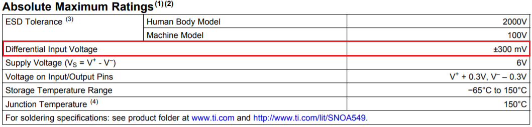 I'm using lmp2231 to buffer the output of a very high impedance electrochemical sensor. The lmp2231 features an astounding low input bias current (femtoamps) and that's what I need to operate the sensor without affecting its chemistry. When power is removed from the lmp2231, the sensor will continue to apply approximately 1 volt to the lmp2231's non-inverting input which exceeds the Abs Max rating of 0.3 volts. I cannot clamp the sensor with a diode to the positive supply without creating unacceptable leakage current through the diode. However, I am able to put a high value resistor in series with the sensor (for example, 10 Mohms) to limit input current to less than 1 uA. Will this protect the input of the lmp2231? There is insufficient data on the lmp2231 spec sheet to determine whether the lmp2231 incorporates in-circuit overstress protection that can handle a microamp input current if the input voltage exceeds 0.3 volts (above the positive supply). Many op amps can handle mA overstress currents, but this op amp has such low input bias current that it must have a lower (or even nonexistent) overstress limit. If there is a TI engineer out there who knows what sort of ESD/EOS protection is on this chip, I'd love to hear from him/her.
